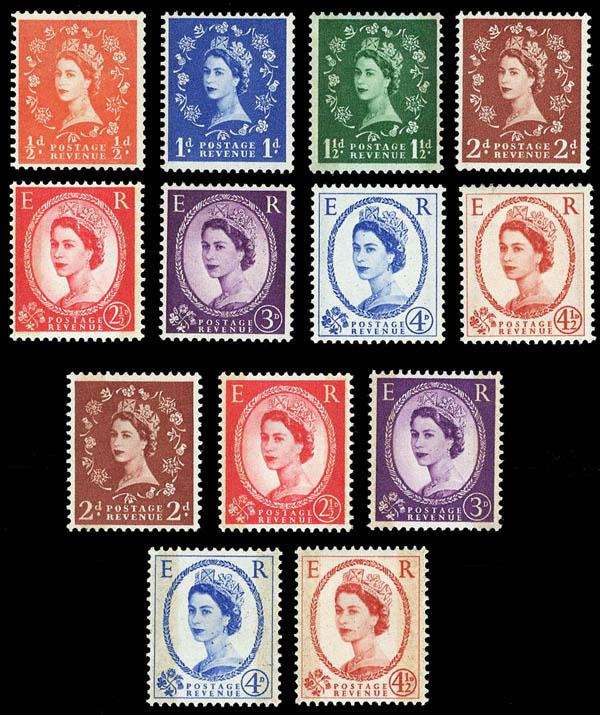 Great Britain, 1958-61, Queen Elizabeth II Graphite-Lined Issue, ½d to 4½d complete (Scott 353c-360a, 356cp-360ap. SG 587/594, 605/609), setof 8, plus 1959, Queen Elizabeth II (phosphor-graphite), 2d light red brown - 4½d chestnut, set of 5, o.g., never hinged, Very Fine. Scott $243. SG £200 ($260). Estimate $75 - 100. Scott $243 Suggested Bid $75-100 (Image)
