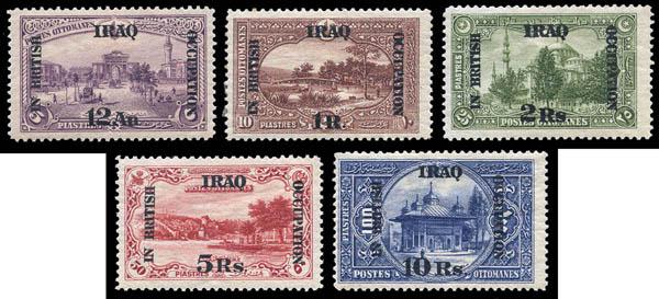 Mesopotamia: British Occupation of Iraq, 1918-21, overprinted Turkish Pictorial issue complete (Scott N28-N41. SG 1/14), set of 14, o.g., hinged; 1r with light crease, otherwise Fine to Very Fine. Scott $177. SG £200 ($260). Estimate $50 - 75. Scott $177 Suggested Bid $50-75 (Image)