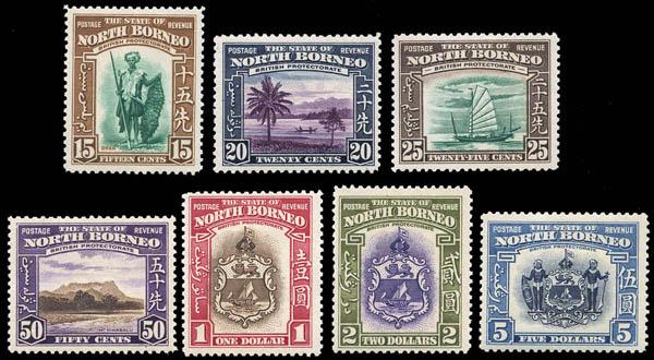 North Borneo, 1939, Pictorial definitive set, 1¢ to $5 complete (Scott 193-207. SG 303/317), set of 15, o.g., mostly lightly hinged (5r with small hinge remnant). Scott $712. Estimate $200 - 300. Scott $712 Suggested Bid $200-300 (Image)