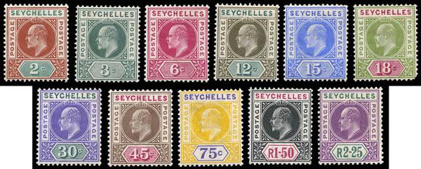 Seychelles, 1903-06, King Edward VII definitives, all 3 sets complete (Scott 38-48, 49-51, 52-62. SG 46/56, 57/59, 60/71), o.g., hinged or hinge remnant, Fine to Very Fine. Scott $331. SG £324 ($420). Estimate $100 - 150. Scott $331 Suggested Bid $100-150 (Image)