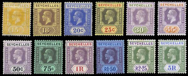 Seychelles, 1921-28, King George V, 2¢ to 5r complete, Multiple Script CA watermark (Scott 91-114. SG 98/123), set of 24, o.g., hinged or hinge remnant; 2.25r with some gum toning (catalog value $21), Fine to Very Fine overall. Scott $241. SG £200 ($260). Estimate $75 - 100. Scott $241 Suggested Bid $75-100 (Image)