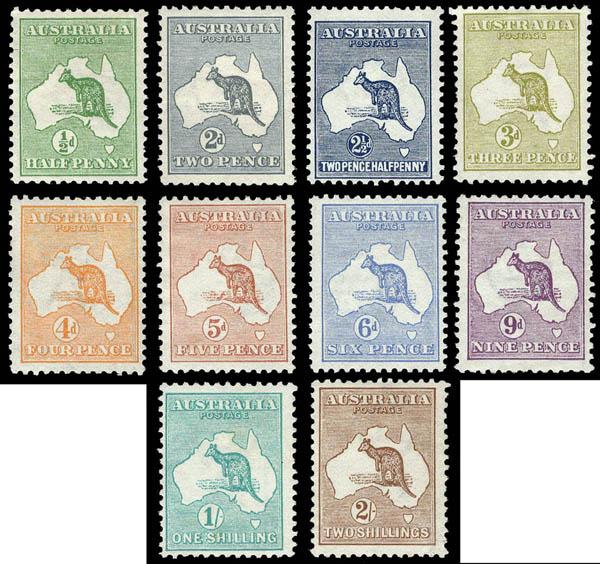 Australia, 1913, Kangaroo and Map, ½d to 2s (Scott 1, 3-11. SG 1, 3-12), 1st watermark, missing only the 1d carmine and of course the high values but a great start to the complete set, o.g., hinged, Fine to Very Fine. Scott $1,322. SG £1,026 ($1,320). Estimate $250 - 350. Scott $1,322 Suggested Bid $250-350 (Image)