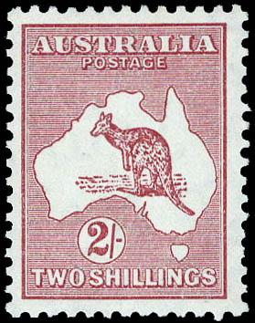 Australia, 1924, Kangaroo and Map, 2s maroon (Scott 53. SG 74), 3rd watermark, o.g., never hinged (light diagonal gum bend), Very Fine. Scott $160 for n.h. SG £85 for hinged ($110). Estimate $40 - 60. Scott $160 for n.h. Suggested Bid $40-60 (Image)