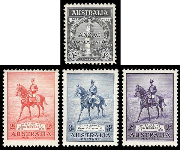 Australia, 1935, 1s Gallipoli, plus King George V Silver Jubilee complete (Scott 151, 152-154. SG 155, 156/158), o.g., never hinged, Very Fine. Scott $184 for nh. SG £87 for hinged ($110). Estimate $60 - 80. Scott $184 for nh Suggested Bid $60-80 (Image)