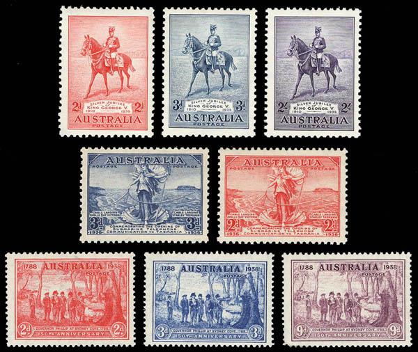 Australia, 1935-36, 3 different complete sets: KGV Silver Jubilee, Telephone Link and South Australia Centenary (Scott 152-154, 157-158, 163-165. SG 156/8, 159/60), o.g., never hinged, Fine to Very Fine. Scott $144. Estimate $50 - 75. Scott $144 Suggested Bid $50-75 (Image)