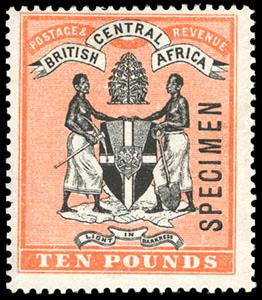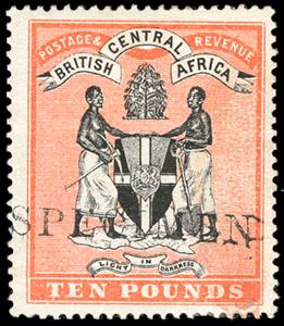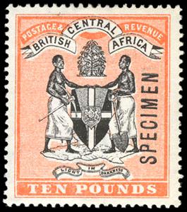 British Central Africa, 1896, Arms of the Protectorate, £10 black & orange, overprinted "Specimen". Crown CC watermark, o.g., lightly hinged, lovely colors, fresh and Fine. SG No. 41s. Scott No. 41 var.; $275. US$0 (Image)