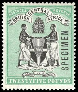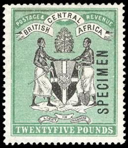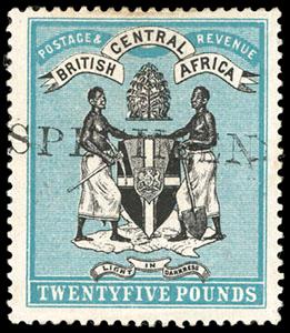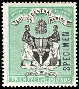 British Central Africa, 1896, Arms of the Protectorate, £25 black & green, overprinted "Specimen". Crown CC watermark, large, nicely centered, bright colors, Very Fine and scarce. SG No. 42s. Scott No. 42 var.; $425. US$0 (Image)