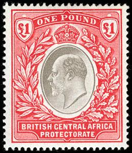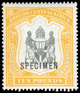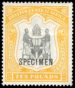 British Central Africa, 1897, Arms of the Protectorate, £10 black & yellow, overprinted "Specimen". A pristine example, o.g., never hinged, post office fresh and beautifully centered, Extremely Fine. SG No. 52s. Scott No. 56 var.; $300 for hinged. US$0 (Image)