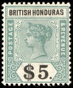 British Honduras, 1899-1901, Queen Victoria, 5¢-$5 complete. Set of 6 values, o.g., lightly hinged, rich colors, F.-V.F. SG No. 55//65 £735 ($930). Scott No. 52-57; $634. US$0 (Image)