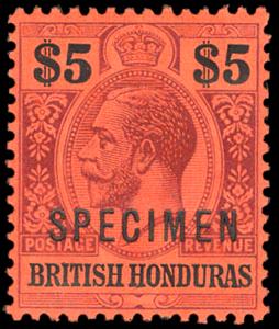 British Honduras, 1913-17, King George V, 1¢-$5 complete, overprinted "Specimen". O.g., never hinged, an Extremely Fine set. SG No. 101/10 £300 ($380). Scott No. 75-84; Estimate $100 - 150. US$100-150 (Image)