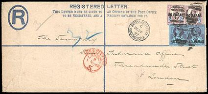 British Offices in the Turkish Empire, 1887, Queen Victoria, 40pa on 2½d purple on blue, two singles. In combination with 1887, Queen Victoria, 80pa on 5d purple and blue, two singles (5) on G.B. 2d registration entire to London, England, all tied by barred "C" handstamps with matching "British Post Office, Constantinople, Oc 26, 92" cds alongside, red London entry date stamp; couple file folds not affecting stamps, otherwise Very Fine. SG No. 4; Estimate $500 - 750. US$500-750 (Image)