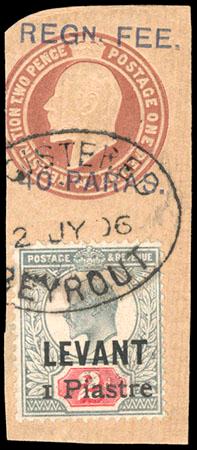 British Offices in the Turkish Empire, 1906, KEVII, 1pi on 2d gray green & carmine. Tied by oval "Beyrout, Registered, 2 Jy, 06" First Day of Issue date stamp on postal indicia piece, Very Fine, with 2004 Brandon certificate. SG No. 15; £750 ($940). US$0 (Image)