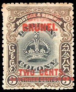 Brunei, 1906, 2¢ on 3¢ brown & black, "Brunei" double overprint. O.g., minor disturbance, 2003 B.P.A. cert states, "misplaced upper overprint partially erased as normal, unused with part original gum", sound and F.-V.F. one of the nicest examples known of this Rarity, with 1955 and 2003 B.P.A. certificates. Scott No. 2a; $4,500. US$0 (Image)