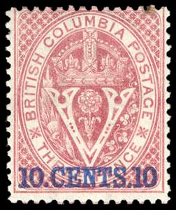 British Columbia & Vancouver Island, 1867, Seal of the Colony, 2¢ on 3d-$1 on 3d, perf. 14 issue complete. O.g., 5¢ on 3d or without gum, all bright and fresh, 50¢ on 3d with left wing margin, a F.-V.F. set. Scott No. 8-13; $6,160. US$0 (Image)
