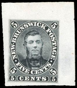 New Brunswick, 1860, 5¢ Connell, trial color proof in black on India. Cut from the compound plate proof of the 5¢ Connell & 10¢ Queen Victoria, exceptionally fresh on bright white paper with large margins all around (full at top & right), Extremely Fine.ex-Sir Gawaine Bailey. Unitrade No. 5TCi var. C$2,000 ($1,400). Scott No. 5P; Estimate $750 - 1,000. US$750-1,000 (Image)