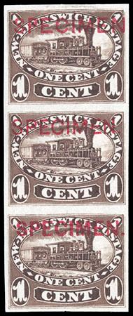New Brunswick, 1860, 1¢ red lilac, plate proof on India overprinted "Specimen". Vertical strip of 3, "Specimen" types D, B, C, respectively, Very Fine.Catalog value includes 100% premium for three types of "Specimen" overprint. Unitrade No. 6Piii-v C$800 ($560). Scott No. 6P; Estimate $200 - 300. US$200-300 (Image)