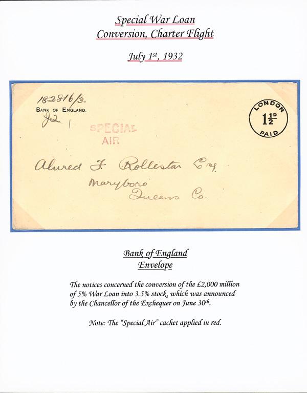 1932 (July 1), Trio of Special War Loan Conversion Charter Flight covers, the first on Bank of England corner card envelope with "London/1½d/Paid" handstamp; the second "On His Majesty's Service" Post Office Savings Bank cover, text and "Official/[crown]/Paid" handstamp in red; the third on Bank of Ireland envelope with red payment handstamp; each with red "Special/Air" handstamp applied. Each carried the Chancellor of the Exchequer's June 30 notice (not included) concerning the conversion of the £2,000,000,000 of 5% War Loan into 3.5% stock. Scarce. Ex Lister. (PDF for this Lot) (Image)