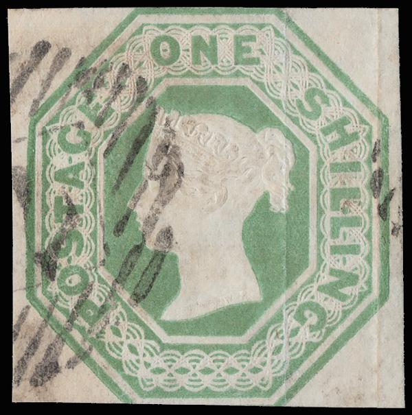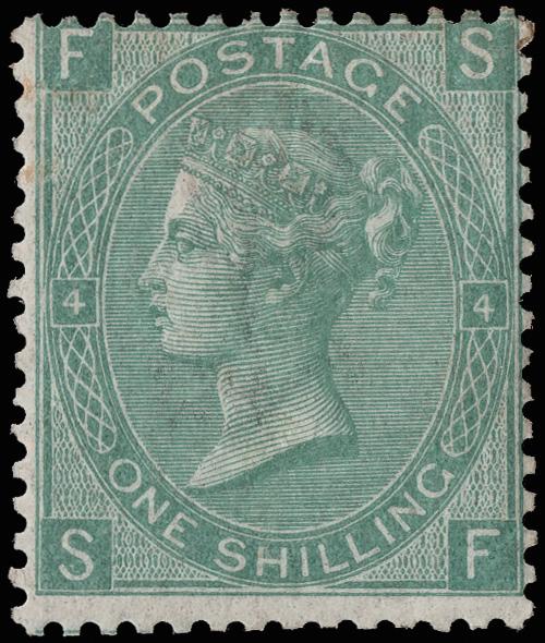 1867, Queen Victoria, 1s green, Spray of Rose watermark (Scott 54), plate 4, o.g., hinge remnant; light corner crease at the lower right and a bit of trivial toning at the top (visible only on the reverse), about Fine, with a 2024 P.F. certificate. SG 117; £800 ($1,070). Scott $1,125. (Image)