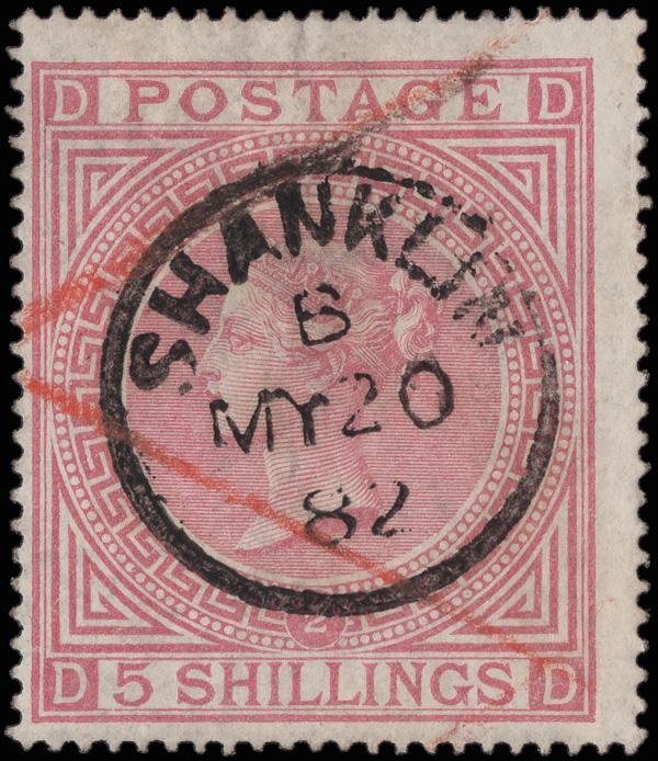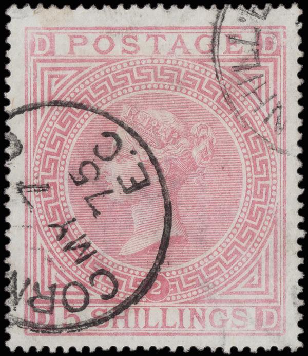 1867, Queen Victoria, 5s pale rose, Maltese Cross watermark (Scott 57a), plate 2, beautifully centered with two partial "CORNHILL B.O/E.C." c.d.s.s, May 7, 1875; slight bit of soiling, otherwise Very Fine. SG 127; £725 ($970). Scott $775. (Image)
