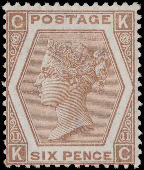 1872, Queen Victoria, 6d chestnut, Spray of Rose watermark (Scott 59), plate 11, o.g., small hinge remnant, fresh and attractive; small, light crease at the bottom, otherwise Fine, with a 2024 P.F. certificate. SG 122a; £800 ($1,070). Scott $925. (Image)
