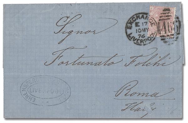 1875, Queen Victoria, 2½d rosy mauve on white paper, Anchor watermark (Scott 66), plate 3, tied by a neat Exchange/lpl "466" duplex handstamp, May 10, 1876, on a folded cover to Rome, Italy; red oval "PD" and Calais French entry c.d.s.; backstamped Rome on May 13, Very Fine. SG 139; £180 ($240). Scott $275. (Image)