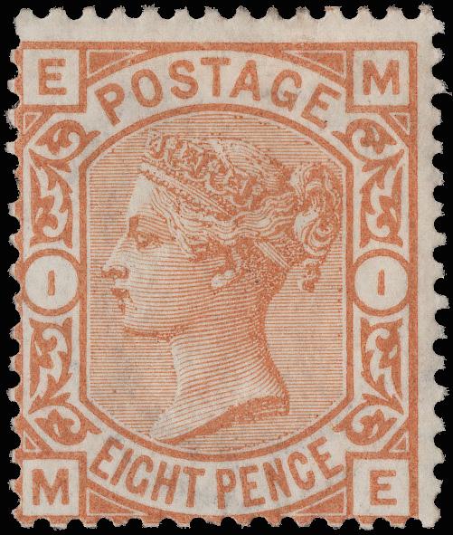 1876, Queen Victoria, 8d orange, Large Garter watermark (Scott 73), o.g., lightly hinged, bright color; single nibbed perf at the left, about Fine appearance, with a clear 2025 P.F. certificate. SG 156; £1,850 ($2,470). Scott $2,150. (Image)