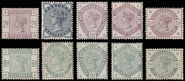 1883-8, Queen Victoria, "Lilac & Green Issue," ½d to 1s complete (Scott 98-107), o.g., lightly hinged, fresh, stron gcolor throughout; 5d with some stained pef tips, 99 with some light gum-toned perfs at the left & bottom, and1s with two tiny thins, otherwise Fine to Very Fine. A very attractive set., 9d & 1s with 2024 P.F. certificates. Scott $6,295. (Image)