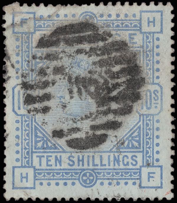 1884, Queen Victoria, 10s ultramarine on bluish paper, Anchor watermark (Scott 109b), exceptionally well centered; but heavily canceled with a light corner crease and a few shorter perfs at the top. SG 177; £7,000 ($8,890). Scott $8,500. (Image)
