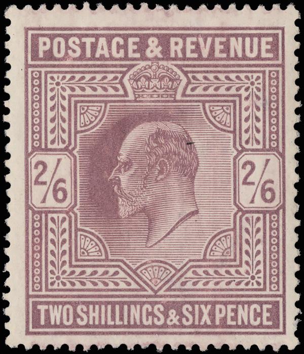 1905, King Edward VII, De La Rue printing, 2s6d pale dull purple, chalky paper (Scott 139d), o.g., very lightly hinged, Fine to Very Fine. SG 261; £350 ($470). Scott $290. (Image)