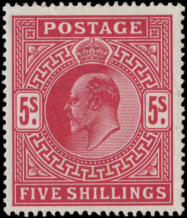 1902, King Edward VII, De La Rue printing, 5s bright carmine (Scott 140), a gorgeous mint single, o.g., very lightly hinged, fresh and well centered with incredible color, Very Fine. SG 263; £450 ($600). Scott $450. (Image)