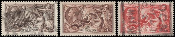 1918, King George V "Seahorse", B-W printing, 2s6d pale brown, 2s6d chocolate & 5s rose-red (Scott 179a, 179b, 180), a fresh, well centered group; the 2s6d chocolate with a faint diagonal crease, otherwise Very Fine. SG 415a, 414, 416; £295 ($390). Scott $300. (Image)