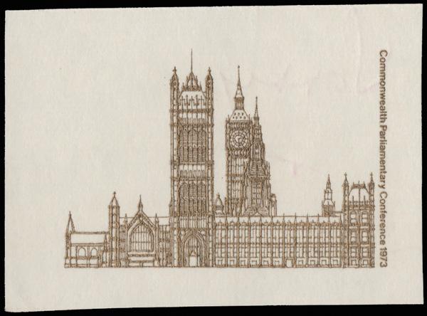 1973, 10p Westminster Palace from Millband, proof of the gold color only (Scott 706 var.), the palace and the text, on thick bond paper with blue rulled lines on the reverse; also on the reverse: red manuscript "Lexxy"(?), Very Fine and rare. SG 940 var. (Image)