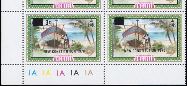 1976, 3¢ on 40¢ New Constitution, "3c" omitted (Scott 231 var.), the bottom right stamp in a sheet margin block of 10, o.g., never hinged, Very Fine. SG 226a; £500 ($640). (Image)