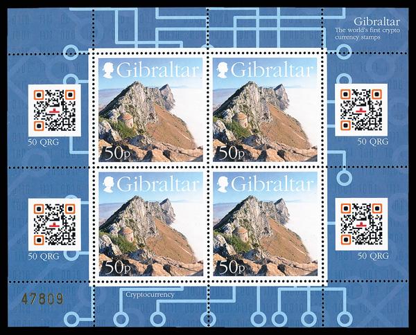 2018, 50p Rock of Gibraltar, crypto-currency miniature sheet of four (Scott 1532 footnote), o.g., never hinged, Post Office fresh and sound, serial number 47809 (of 50,000 issued); unscanned, giving you the chance to earn 200QRG ("Corgi"?) crypto coins, Very Fine, the world's first crypto currency stamps.(Image)