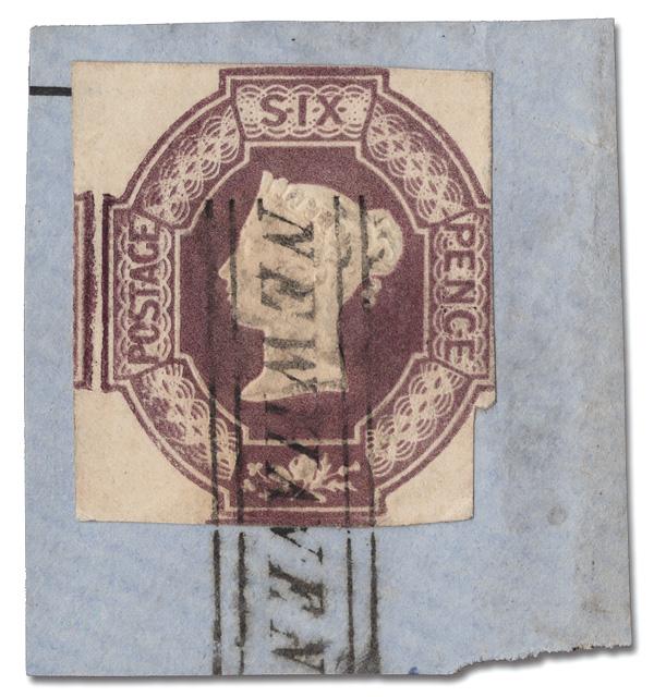 1854, Queen Victoria (embossed), 6d purple (Scott 7), exceptionally fresh, tied on piece by an clear "NEWHAVEN" (East Sussex) straightline cancel; oversize margins at the left, cut in at the right, Fine and attractive. SG 60; £1,000 ($1,340). Scott $1,000. (Image)