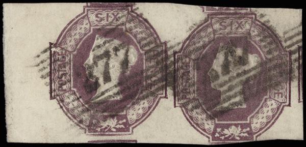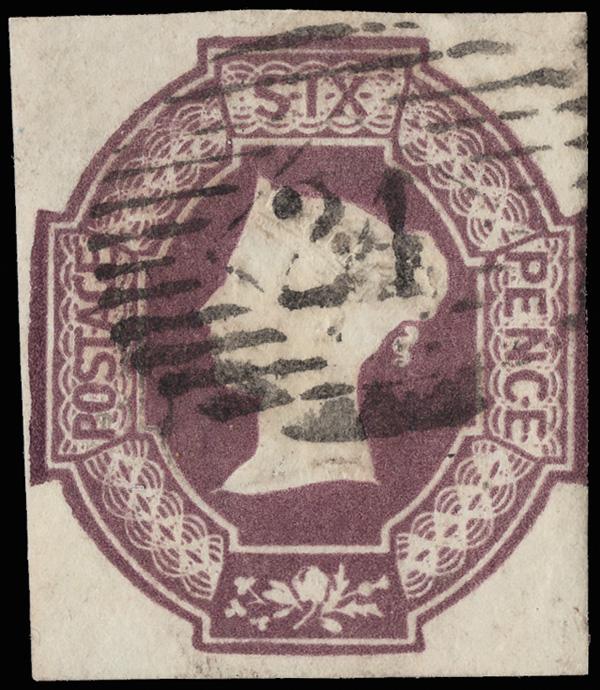 1854, Queen Victoria (embossed), 6d purple, inverted watermark (Scott 7d), large margins except barely shaved at the right, neat Overton (Hants.) "24" numeral cancel, Fine to Very Fine, with a 2025 P.F. certificate. SG 60wi; £1,000 ($1,340). Scott $1,150. (Image)