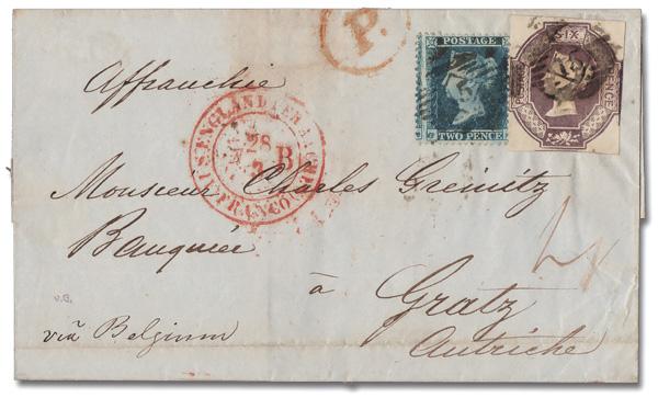 1854, Queen Victoria (embossed), 6d dull lilac (Scott 7a), barely shaved on two sides, used with a 2d thick lines (17), tied together by numeral "15" cancels on an 1855 folded cover to Gratz, Austria; red oval "P.D." and Mar 28 "England Per Aachen/Franco" double circle datestamp; backstamped with a "CZ/MR 27/1855" originating c.d.s. and a Mar 31 Gratz receiver, Very Fine. SG 59; £1,900 ($2,540). Scott $2,850. (Image)