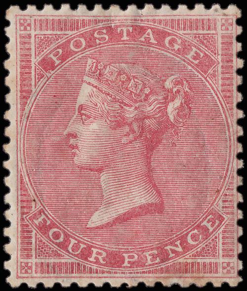 1857, Queen Victoria, 4d rose on thick glazed paper, Large Garter watermark (Scott 26b), an attractive example of this rare variety, o.g., hinge remnant, decently centered with bright fresh color; gum vey lightly toned, the toning barely visible on the bottom perfs, Fine to Very Fine, with a 2024 P.F. certificate noting "light toning at bottom." SG 66b; £6,500 ($8,680). Scott $7,475. (Image)