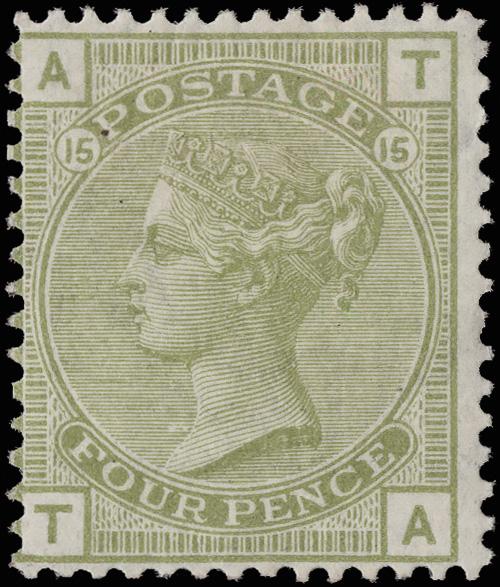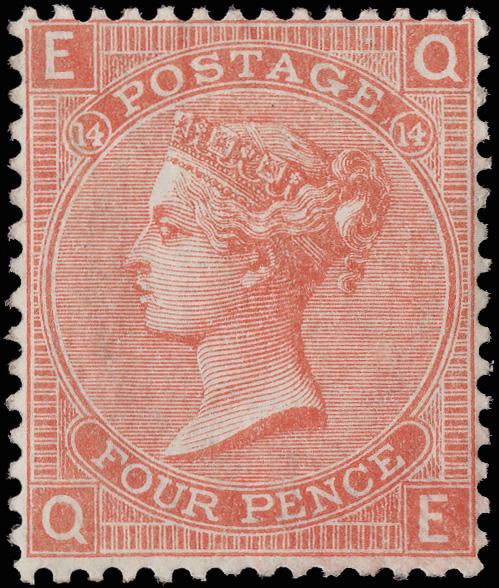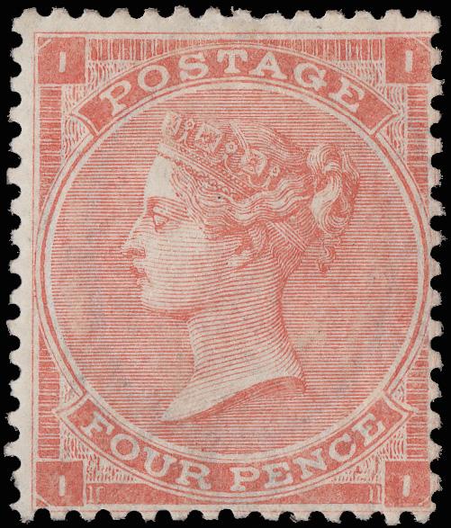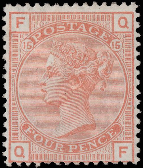1863, Queen Victoria, 4d bright red, hair lines, Large Garter watermark (Scott 34b), virtually full o.g., small hinge remnant, bright, fresh and reasonably well centered, Fine to Very Fine, signed A. Brun, with a 2024 P.F. certificate noting "part o.g." SG 81; £2,300 ($3,070). Scott $2,300. (Image)