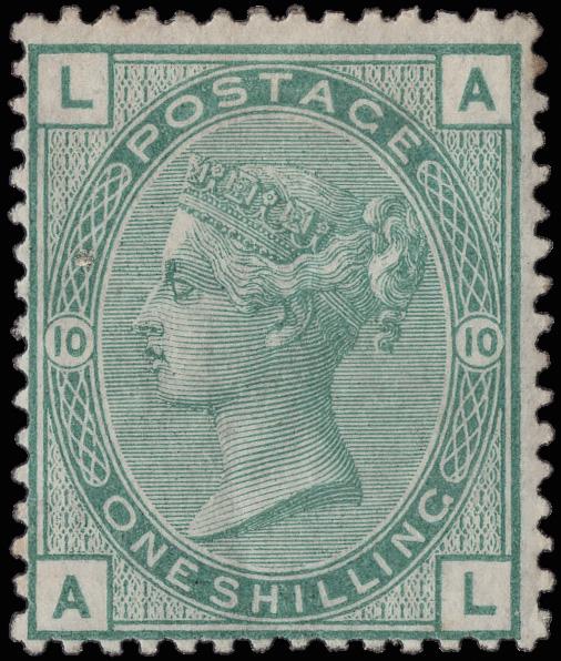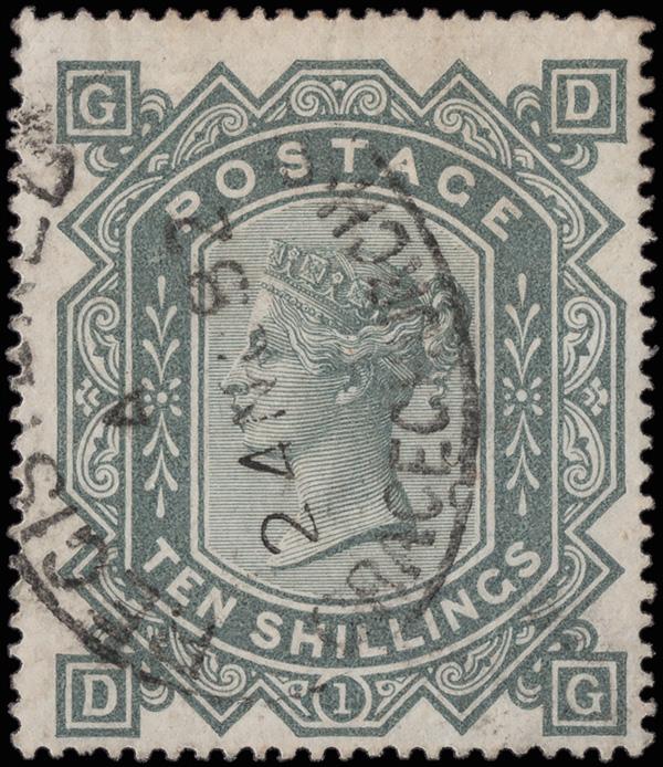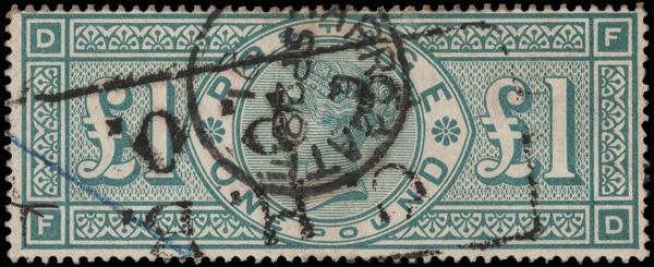 1891, Queen Victoria, £1 green (Scott 124), canceled boxed "C.H.B./G.P.O", Harrogate (N. Yorks.) c.d.s., Sep 28, 1891, and blue crayon, Fine. SG 212; £800 ($1,070). Scott $925. (Image)