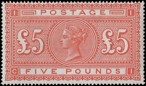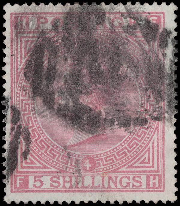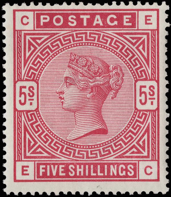 1884, Queen Victoria, 5s rose on white paper, Anchor watermark (Scott 108), o.g., hinge remnant, wonderfully fresh with outstanding color, Fine to Very Fine. SG 180; £1,100 ($1,470). Scott $1,150. (Image)