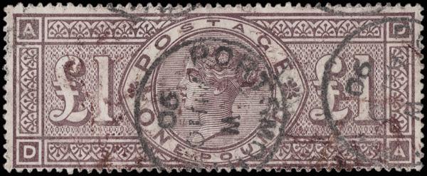 1884, Queen Victoria, £1 brown lilac, Imperial Crowns watermark (Scott 110), parts of four 1890 Portsmouth c.d.s. cancels; small thin spot, Fine appearance, with a 2024 P.F. certificate. SG 185; £3,000 ($4,000). Scott $3,500. (Image)