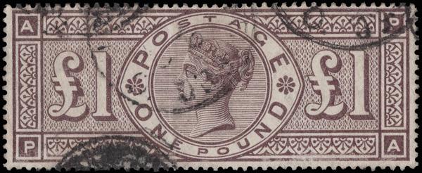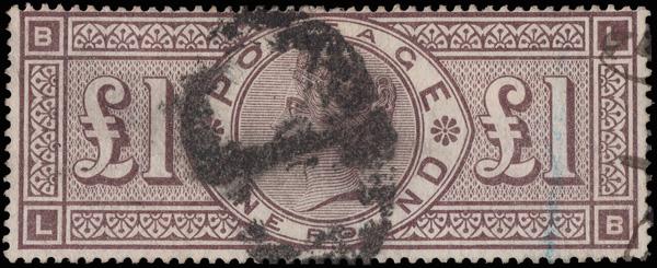 1884, Queen Victoria, £1 brown lilac, Imperial Crowns watermark (Scott 110), parts of four c.d.s. cancels; very faint vertical crease, handsome Very Fine appearance. SG 185; £3,000 ($4,000). Scott $3,500. (Image)