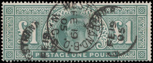 1911, King Edward VII, Somerset House printing, £1 deep green (Scott 142b), a fresh, clean example with "West-Strand B.O./W.C, FE 19, 05" c.d.s.s, Fine. SG 320; £750 ($1,000). Scott $850. (Image)