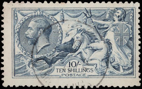 1915, King George V "Seahorse", De La Rue printing, 10s pale blue (Scott 175a), fresh and lightly canceled, Fine to Very Fine, with a 2024 P.F. certificate. SG 413; £900 ($1,200). Scott $900. (Image)