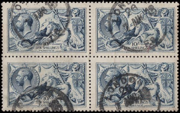 1915, King George V "Seahorse", De La Rue printing, 10s blue (Scott 175b), a marvelous used block of 4, canceled with four "London 26/F.S." c.d.s.s,s, 1 Aug 1918, Fine to Very Fine and rare. SG 412; £3,600 as singles! ($4,810). Scott $3,300 as singles! (Image)