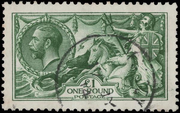 1913, King George V "Seahorse", Waterlow printing, £1 green (Scott 176), an exceptional used example, virtually perfectly centered with deep, rich color and a light c.d.s. cancel, Very Fine to Extremely Fine. SG 403; £1,400 ($1,870). Scott $1,500. (Image)