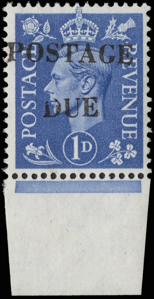 1951, Bury St. Edmunds Provisional "Postage Due" overprint on 1d ultramarine (Scott 281 var.), bottom sheet margin single, o.g., lightly hinged, bright and fresh, Very Fine. One of only 20 unused examples sold., with a 1991 B.P.A. certificate. SG 504 var. S.G. Spec. Q6 var. S.G. Spec. £600 for used on piece. ($800).