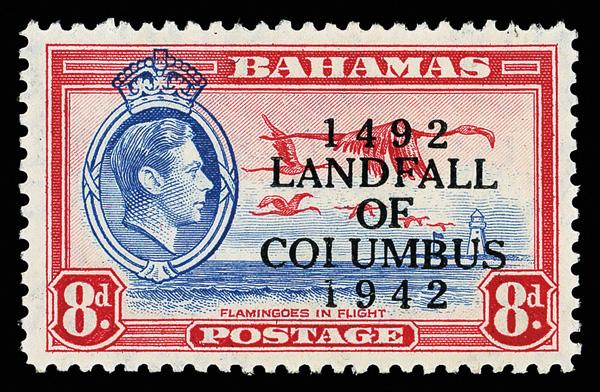 1942, "LANDFALL OF COLUMBUS" on King George VI, 8d ultramarine & scarlet, "COIUMBUS" (Scott 124 var.), o.g., never hinged, a great rarity, Post Office fresh and sound, Very Fine. A choice example of one of the key issues of the colony. SG 170a; £10,000 ($13,350). (Image)