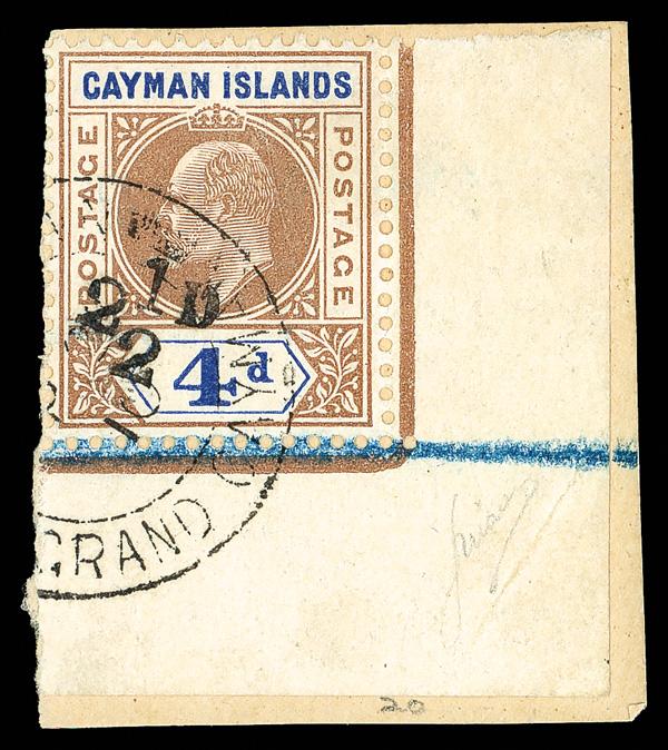1907, King Edward VII, 2½d on 4d brown & blue (Scott 20), a choice, lower right corner margin single, tied to small piece of Registered cover by partial Grand Cayman c.d.s., Very Fine. A rare used issue, with 2001 Brandon certificate. SG 35; £3,500 ($4,670). Scott $3,750. (Image)